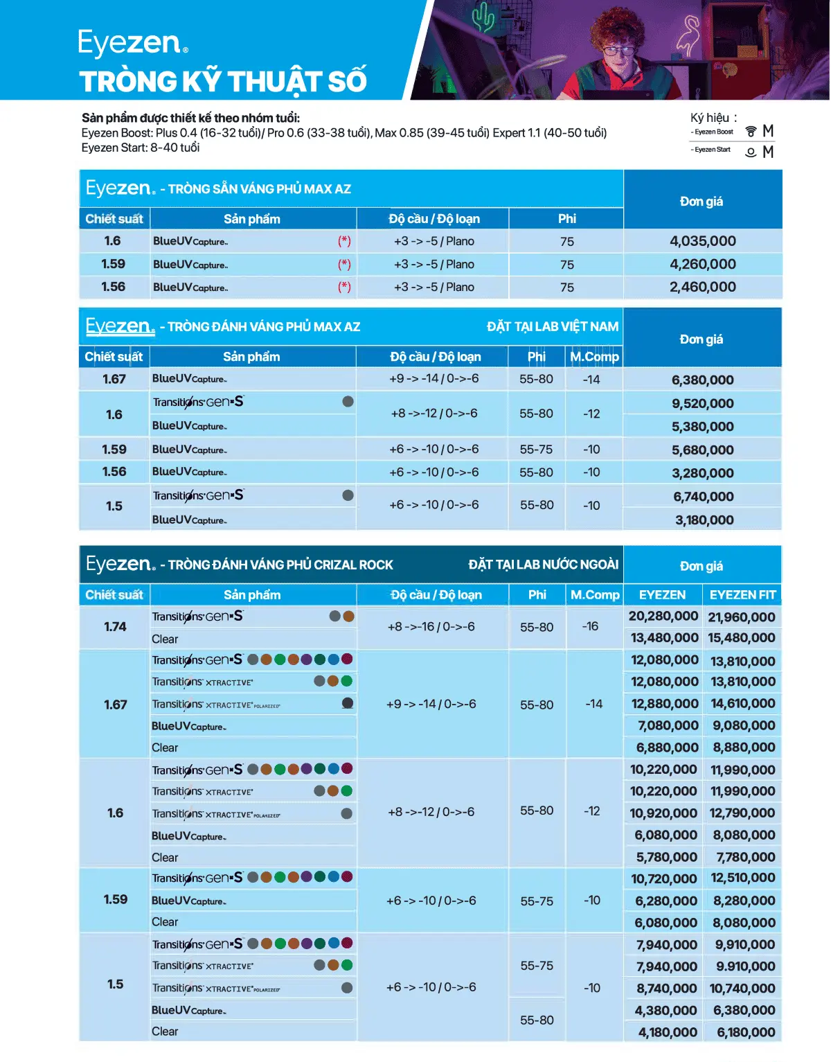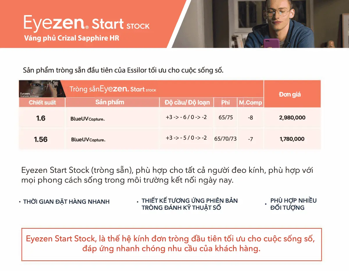 • Eyezen Start: Dành cho người trẻ (dưới 20 tuổi). Ưu tiên sự sắc nét và bảo vệ mắt toàn diện trước màn hình.